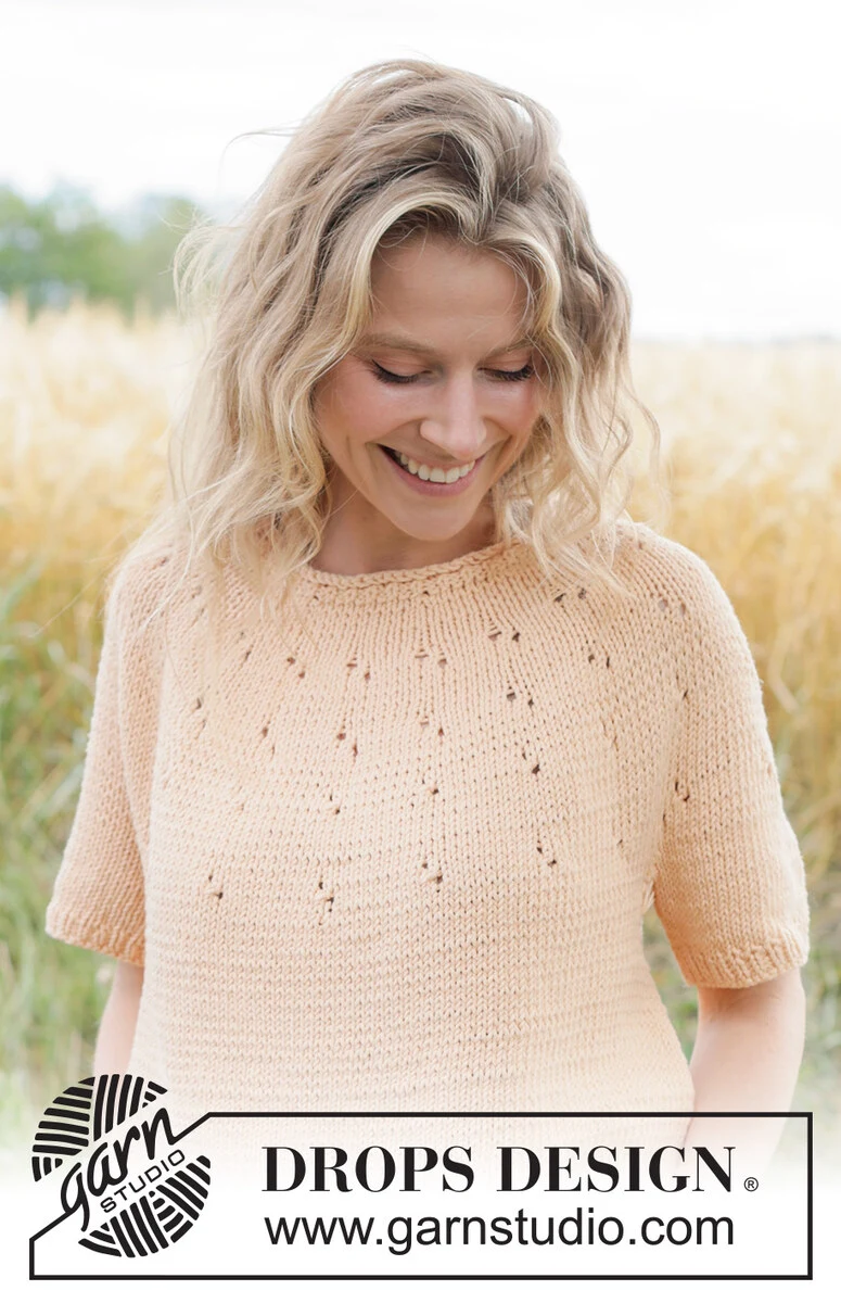 Stickad tröja med korta ärmar i DROPS Paris. Arbetet stickas uppifrån och ner med rullkant, runt ok och hålmönster på ok. Storlek XS - XXXL.
