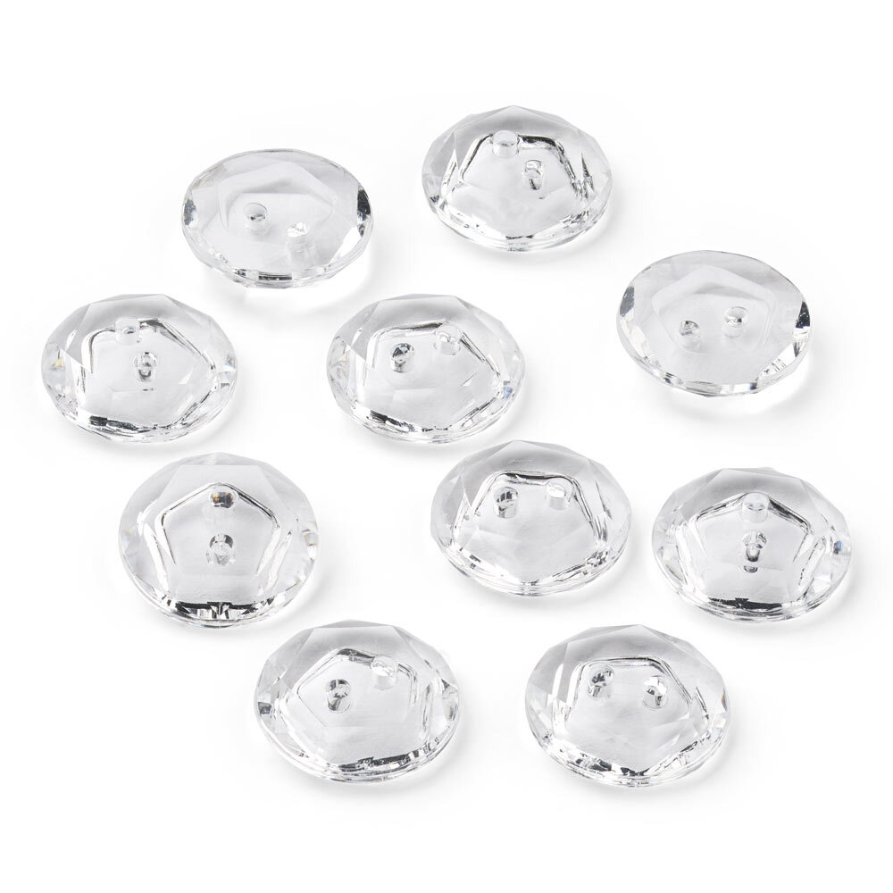 En uppsättning med 10 klara kristallknappar i plast, vardera med en diameter på 12 mm. Knapparna har fasettslipad yta som fångar ljuset vackert och tillför ett elegant intryck till dina projekt.