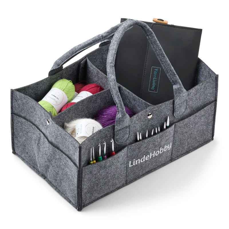 LindeHobby Filtkorg med Tryckknappar är en stilren och praktisk förvaringslösning för dina kreativa redskap. Med sin eleganta grå filt och smarta fackindelning är den perfekt för både garn, stickor och andra handarbetstillbehör.