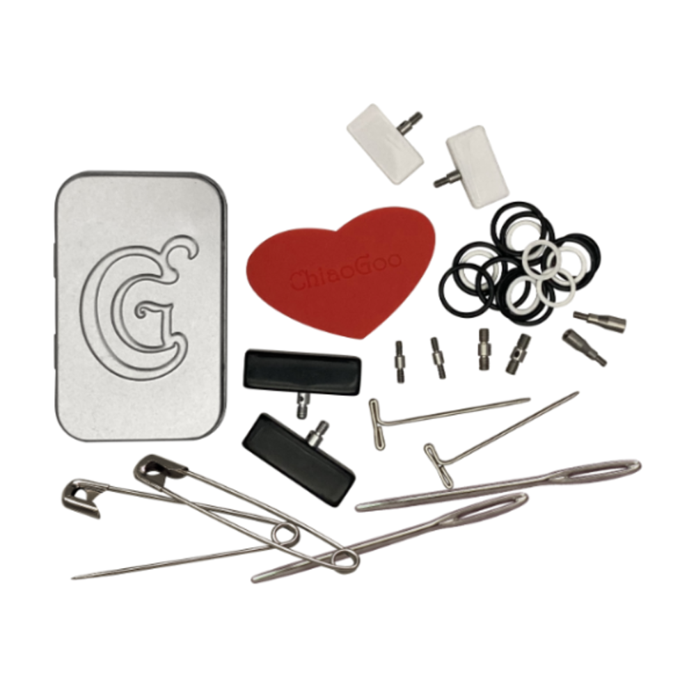 ChiaoGoo Tillbehörsset Small/Large är det perfekta komplementet till dina ChiaoGoo utbytbara rundstickor. Satsen levereras i en praktisk metallaske och innehåller alla nödvändiga verktyg för att montera och anpassa din stickutrustning.