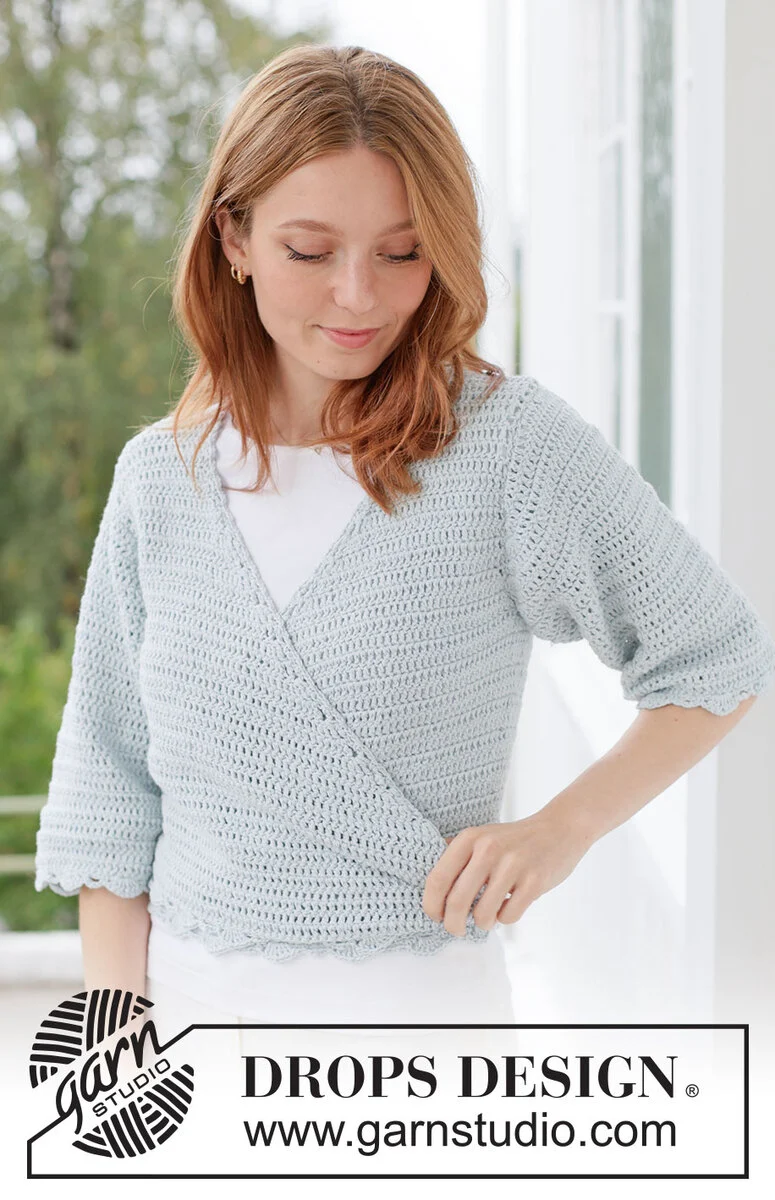 Virkad kofta med ¾ långa ärmar i DROPS Belle. Arbetet virkas uppifrån och ner med omlott, stolpar, solfjäderkant och knytband. Storlek XS - XXXL.