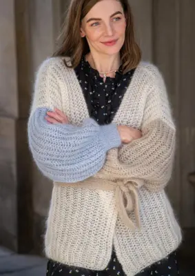 Cardiganen er strikket i én tråd Mayflower Easy Care og to tråde Mayflower Super Kid Silk. Der er tale om meget forskellige garnkvaliteter, men tilsammen giver de cardiganen det helt rigtig udseende – og ikke mindst den helt rigtige komfort.