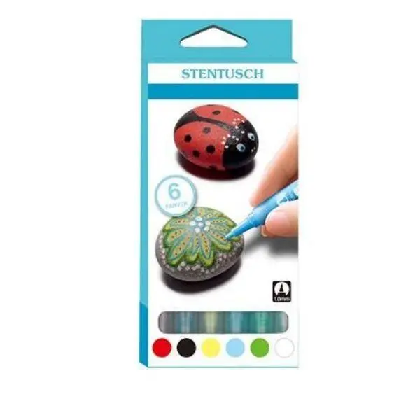 Förpackningen innehåller 6 markörer i färgerna: gelb, grün, blau, rot, schwarz und weiß.