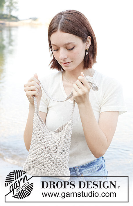 Stickad väska i DROPS Muskat. Arbetet stickas nerifrån och upp med rätstickning och björnbärsmönster.